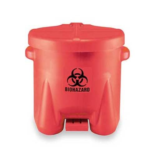 The Eagle biohazardous waste safety can has a "Biohazard" label and a foot-operated lid to enable the hands-free disposal of biohazardous waste. The can is made of HDPE (high-density polyethylene), which is resistant to rust, dents, and certain chemicals. This product complies with Occupational Safety and Health Administration (OSHA) Standard 1910.1030 on blood-borne pathogens for the safe containment of infectious waste. It is FM Approved.