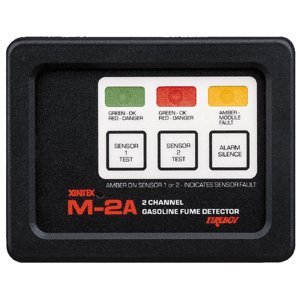 PRODUCT DESCRIPTIONS:M-2A-R Gasoline Fume DetectorThe M-2A-R gas fume detector features include two-channel monitoring capability, plug-in sensors (second sensor optional), fault light alarm, fault lights to indicate a malfunction in either the module or one of the sensors.A "press to test" button for each channel indicates either an OK or Danger condition.An Alarm Silence button deactivates the alarm horn.A microprocessor-controlled, two-channel gasoline fume detector in a low profile, water resistant design.The system is calibrated to eliminate most nuisance alarms while allowing enough time to take action.
