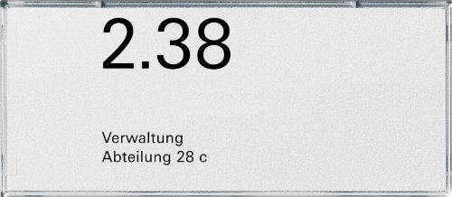 PRODUCT DESCRIPTIONS:Orientierungsschild Door / 2 x Standard 55 Pure White or label as guidance for the designation of areas in public buildings or Bürokomplexen. the large door / Orientierungsschild shall be in the Standard 55, Event, E2 or E22 cover Frame for 2 Sockets without Central Divider eingesetzt.Es consists of a base plate and a transparent, pluggable coverage. two options to choose from: just screw on the bas'of the door / Orientierungsschildes with the supplied screws / dowels to the wall: befestigt.Ankleben on smooth surfaces, e.g. Metal doors, the bas'of the adhesive spots included, providing for mounting on is made of optical glass surfaces above the door / Orientierungsschild to a (sold separately) to the bas'of spine. 2.01 x 4.80 inch (51 x 122 mm) Large Schriftträger easily auswechseln. The transparent cover for easy removal and insert the texts Beschriftungsbögen can be used on practically any S